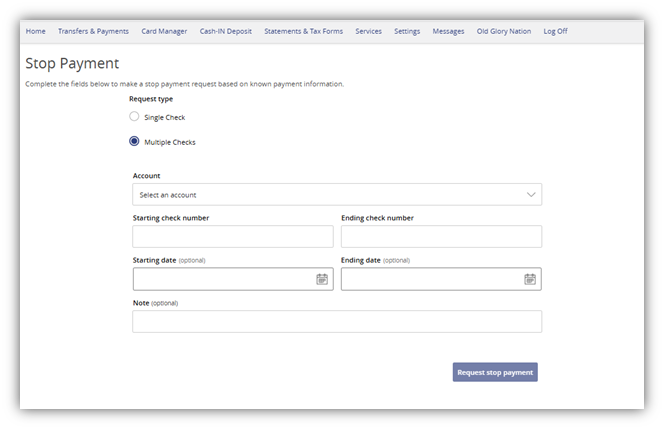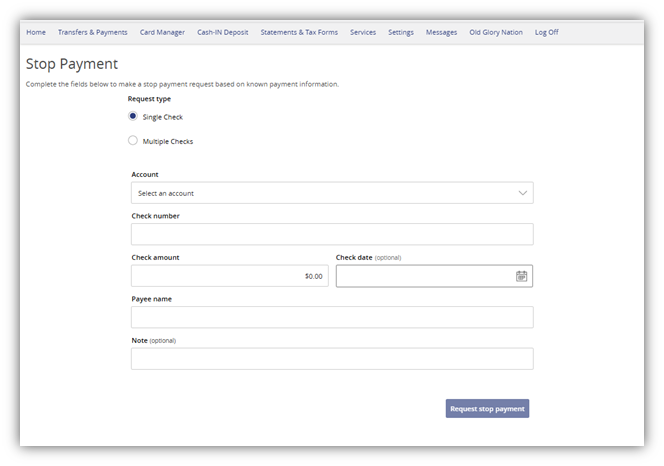 If you are unable to stop a payment within online banking, please call our Customer Service team for assistance: 888-446-5345. Note: Fees will apply on stop payments as detailed in our Terms and Conditions: What are Old Glory Bank's Personal Account fees?